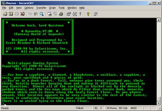 The largest and most detailed fantasy adventure ever to that point for The Major BBS, Kyrandia is styled after the "magic-users" of the popular role-playing game "Dungeons & Dragons". Unlike the previous adventure game products from Moonshae Telecomm, Kyrandia was not based upon the system written by Tim Stryker for Fazuul. Scott Brinker and Richard Skurnick created a brand-new infrastructure to improve performance, add features, and, practically, avoid owing royalties to Galacticomm. Content-wise, Scott Brinker invented a completely new world, with very descriptive room text, more challenging quest plot lines, and even a few NPCs. Kyrandia was also the first adventure game to incorporate a separate editable "location file", allowing for greater map flexibility and customization by Sysops. Several BBSes had heavily customized Kyrandia games on their systems.