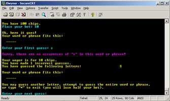 This is a computerized version of the classic word game, but with an added twist. All players start out with 100 (configurable) "game points" and they make "bets" on if they're going to guess the word correctly. If they guess it, they win double, if they guess all the letters, they get one and a half of their bet, and, of course, if they fail to get the word, they lose all their bet. If a player loses ALL his "game points", he must wait until he re-logs on; he will then be given the starting amount again. A "top ten" list keeps competition going, and even allows for organized tournaments for prizes. The word list is an actual DOS "text file" that is scanned "on the fly". We provide you with an extensive one for starters, but adding more words, or even changing the entire file is simple and trouble-free.