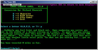 Cross Country Camel is a single-player text interface games. A series of menus guide the user to the game sections, and Top Score lists keep the competition interesting.