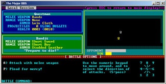 Blademaster is a detailed arena combat simulation. It supports full ANSI screens and ANSI music. This very exciting game pits user vs. monster and user vs. user. It includes an offline editor to create or change weapon, armor, or monster data.