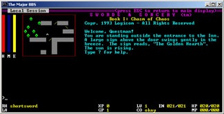 Swords and Sorcery was one of a line of quality Logicom full-screen ANSI modules. The game was a graphical Role Playing Game (RPG). It was briefly released for The Major BBS v6.x, but, unfortunately, removed from sale when Logicom was served with a cease and desist order from Kesmai Corp., who felt the game was too similar to their game Islands of Kesmai which ran on CompuServe.