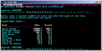 This massive money maker offers a progressive pot and detailed Sysop reports. Full Sysop configurability, from payoff odds to the optional progressive Royal Flush jackpot, with minimum and maximum betting levels. Features full IBM/ANSI cards to users who can support C/S or ANSI, and of course an ASCII version for those users who cannot. Sysop report options will keep track of the profit made.